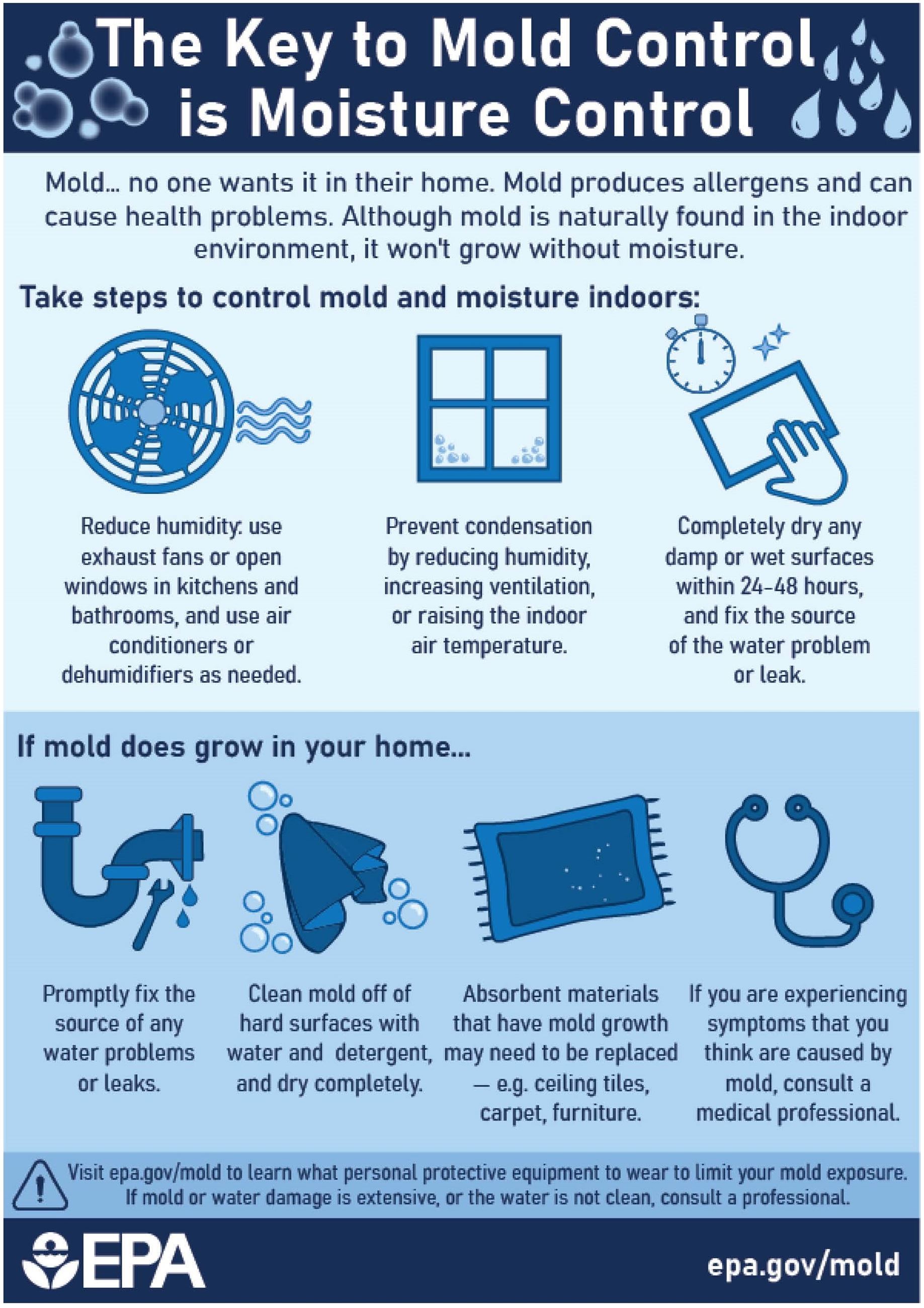 - Use exhaust fans in kitchens and bathrooms to remove moisture. Ensure that appliances like dryers vent outside the home.